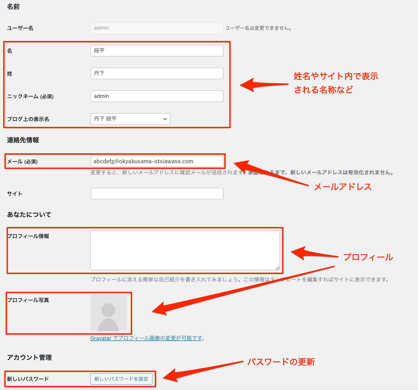 会員及び運営者のアカウント情報を管理する機能です。ユーザーの追加や削除、情報の編集が行えます。ユーザーごとにメールアドレスやパスワード、表示名などのプロフィール情報も設定できます。