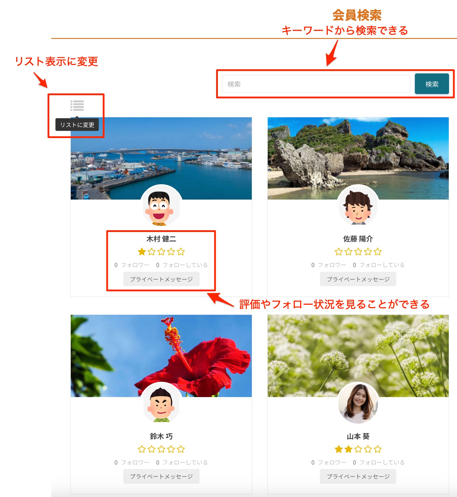 このページで、キーワードによる会員検索がができ、一覧表示はグリッド表示とリスト表示を切り替えることができます。