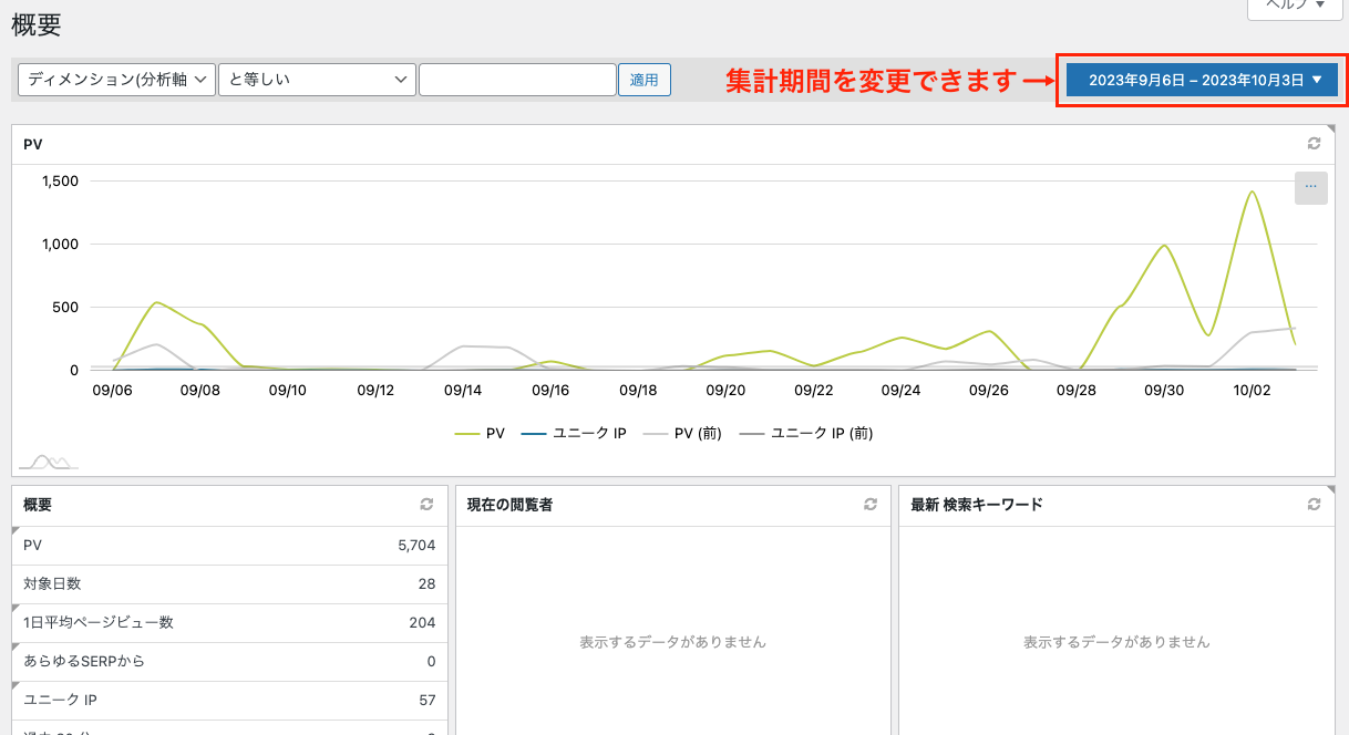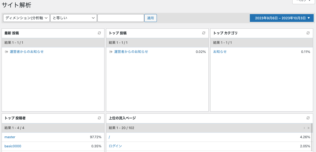 訪問者、サイト解析、トラフィックのデータから主要な項目を表示します。サイトの状態を把握するマーケティングに必要なデータはだいたい表示されています。集計期間を右上の青いドロップダウンリストで変更可能です。